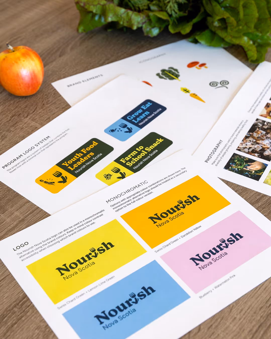 The strategy and research phase also identified the path forward for the visual rebrand. Nourish Nova Scotia needed a new brand identity that would speak directly to both young people and educators, capturing the dynamic, hands-on approach that defines Nourish Nova Scotia’s work. To address this, we led them through a rebrand to create a new identity that would excite and inspire youth, while still being professional enough to engage educators, community partners, and donors.