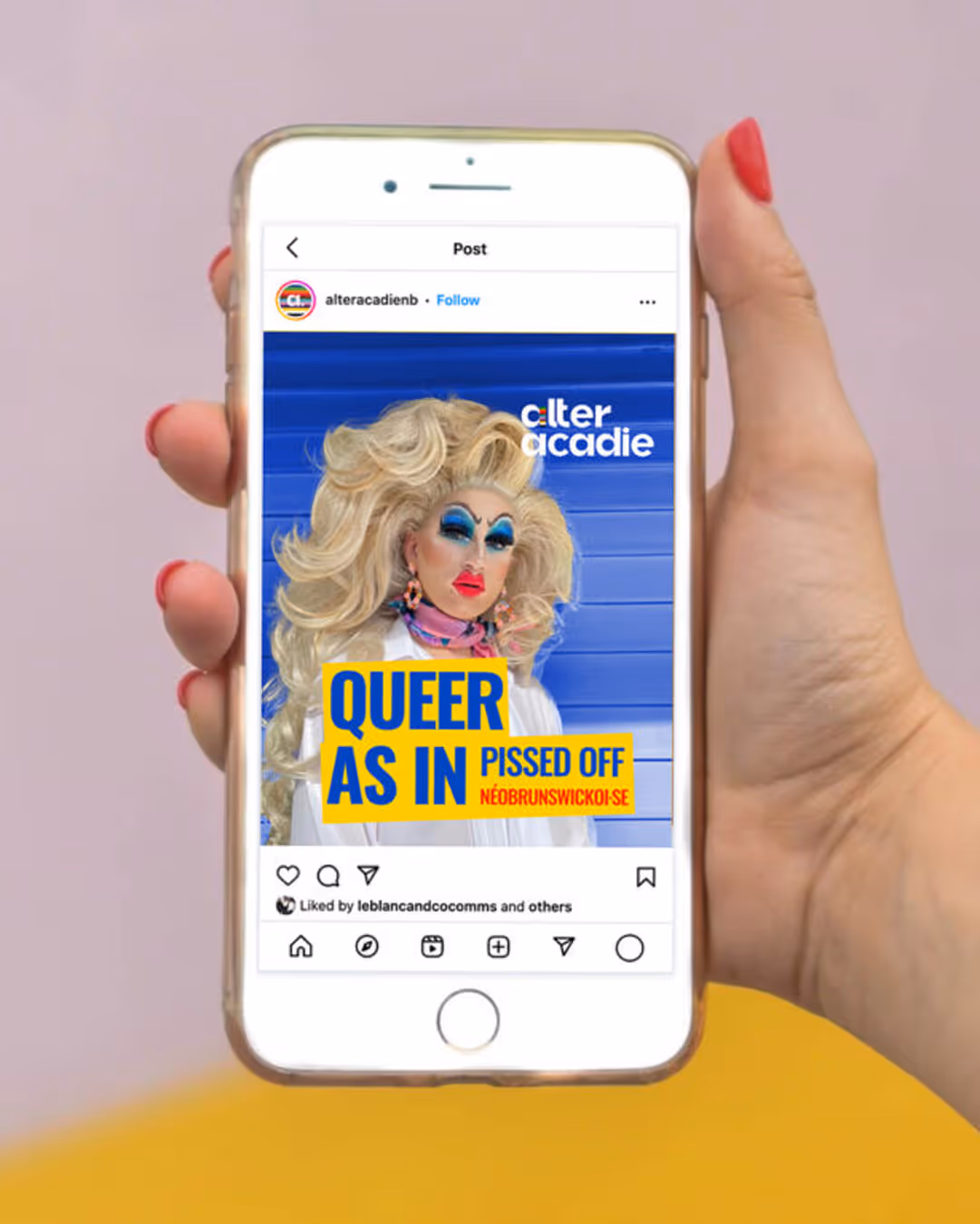 Created by LeBlanc (& co.) Communications, Alter Acadie’s new brand is a fusion of Acadian culture and queer culture. The brand draws inspiration spanning both Acadian elements (including the flag, the star, and lobster) and unapologetically queer elements (such as drag, bright colours, and beautiful photography that shows queer Acadians living as their true and authentic selves). Combining unique cultural references, the new brand captures the essence of the Alter Acadie team, who are bold, truth-telling queer and Acadian advocates.