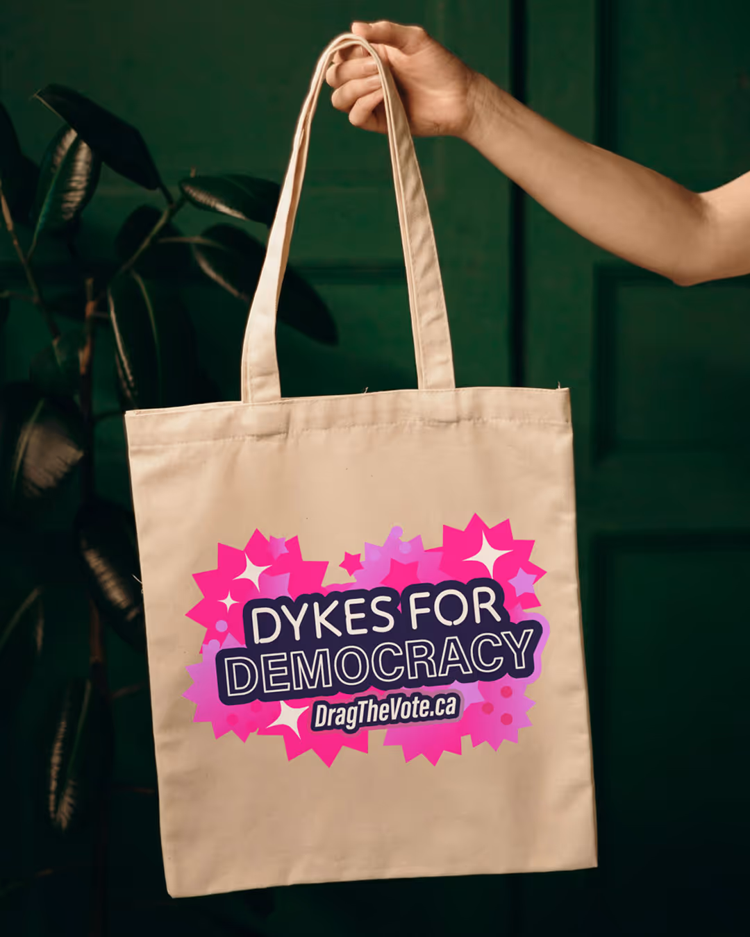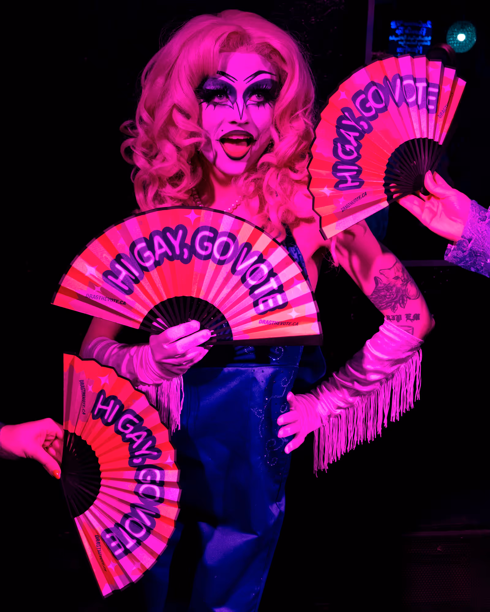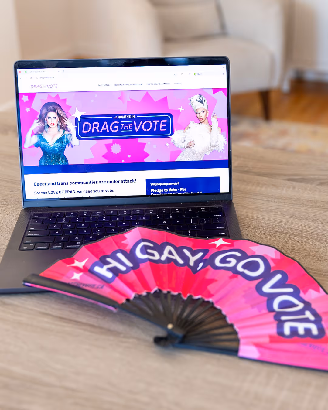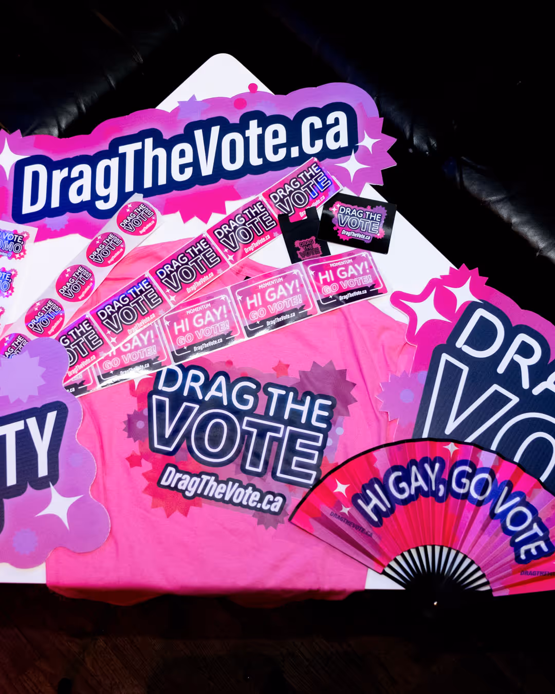 To motivate more 2SLGBTQI+ people and allies to vote in a crucial election, Momentum and LeBlanc (& co.) planned Drag the Vote to be a major campaign with both online and in-person activations, including drag shows across the country. Due to the focus on events, we also prioritized creating merch that made the campaign's drag shows feel like a party celebrating the queer community's political power. We designed a suite of branded merch — including branded t-shirts, crop tops, stickers, and handheld fans that said ‘Hi Gay, Go Vote!” — that was mailed to hundreds of supporters and performers across the country. This ensured that the campaign would be fuelled by an influencer model, as drag performers and partner organizations across the country wore the merch to show their support at drag shows and in their influencer videos online.