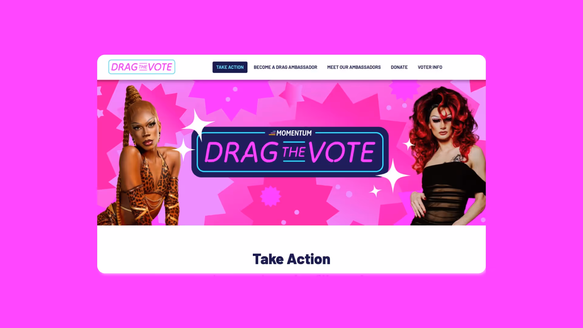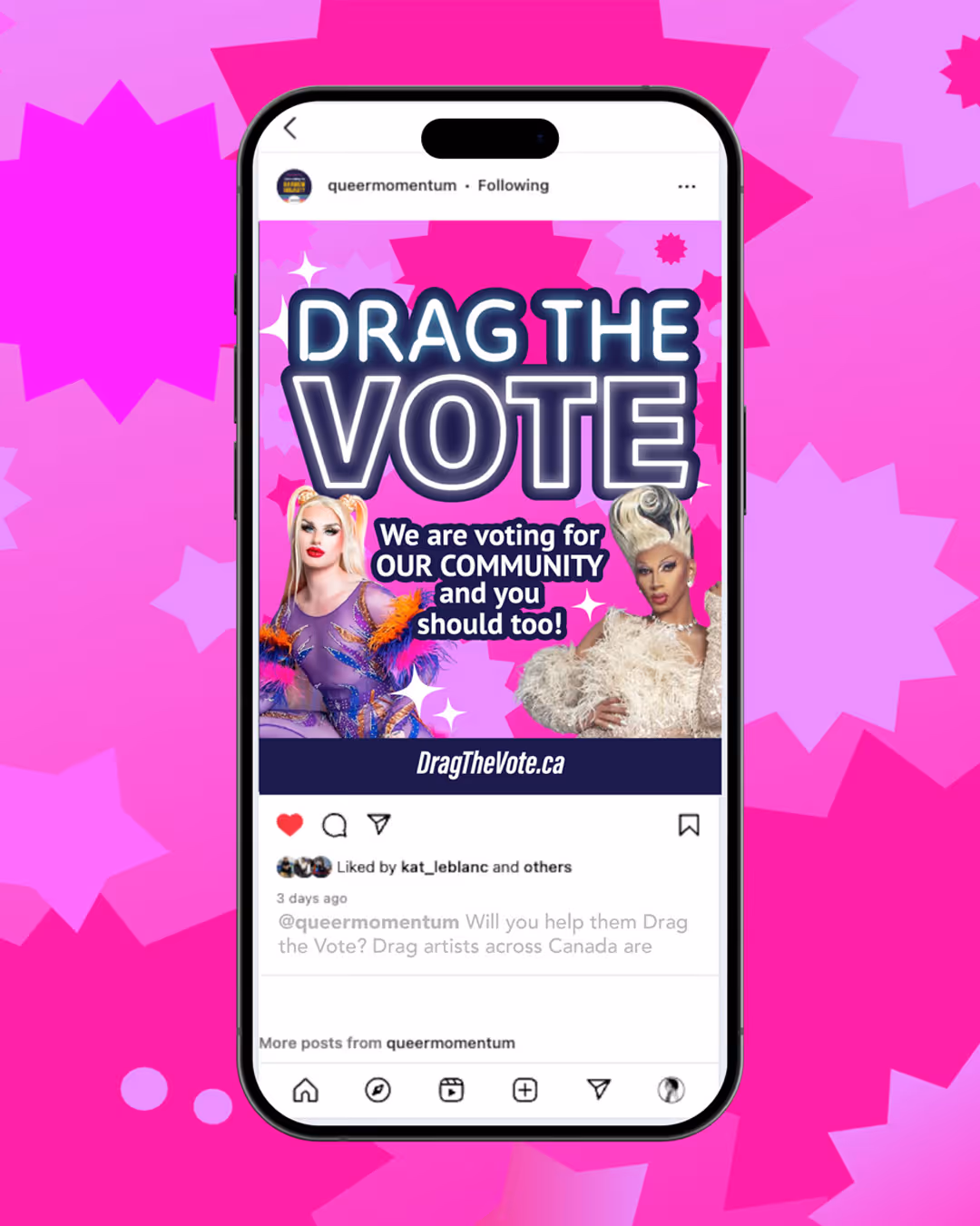 The Drag the Vote campaign launched with support from Momentum, LeBlanc (& co.) Communications, dozens of partner organizations, and drag performers across Canada — including over 250 official “drag ambassadors” who endorsed the campaign through an influencer model. From the queens of Canada’s Drag Race to beloved hometown performers, the ‘drag world’ emphatically joined the campaign and called on the 2SLGBTQI+ community to get out and vote, with queer and trans human rights in mind.
