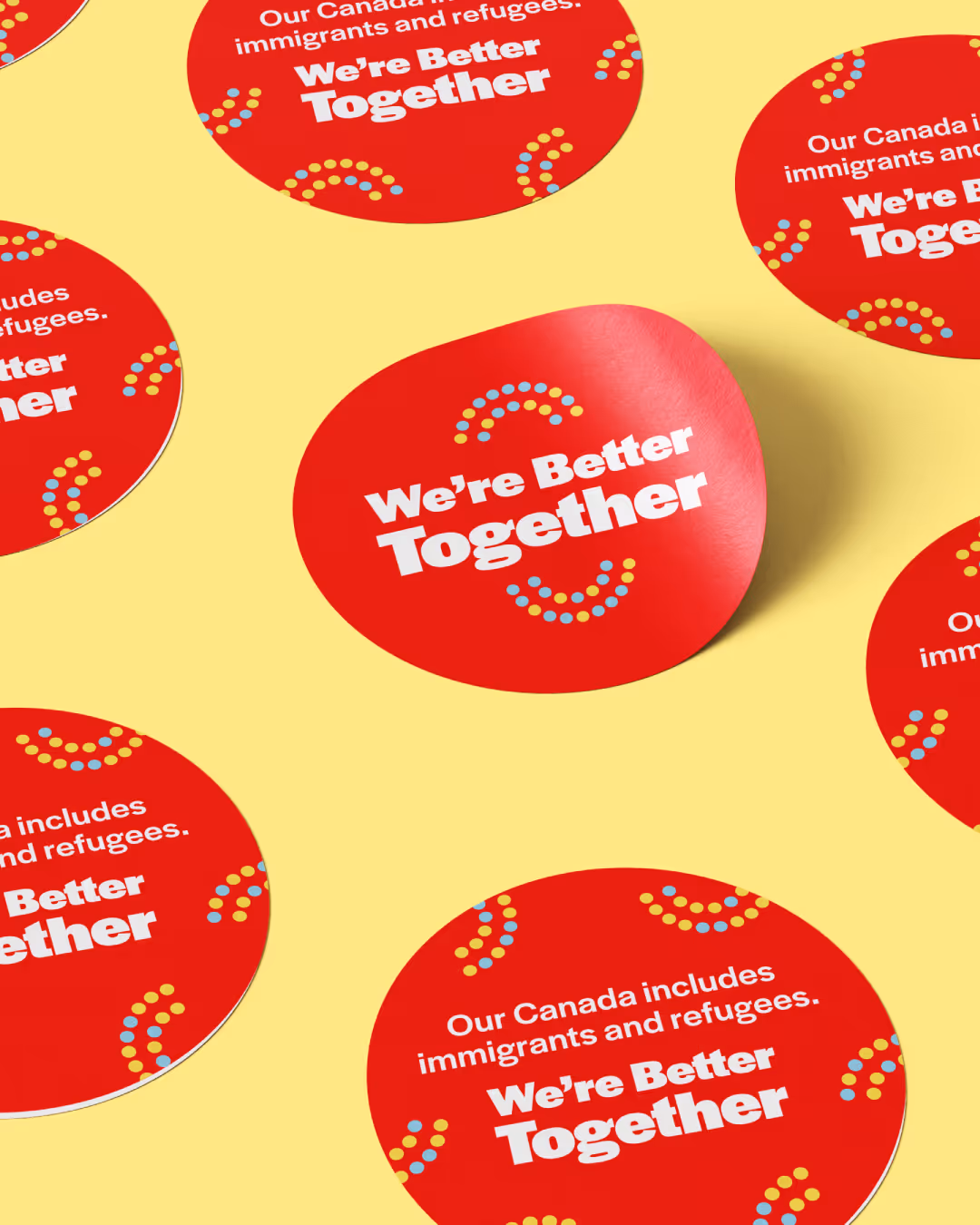 To bring the campaign to life, we developed a bold visual identity that balances optimism with credibility. The palette uses bright, uplifting colours that build on the Canadian Council for Refugees' existing brand while giving the campaign its own fresh energy. At the centre of the campaign's branding is a pair of double arcs made of multicoloured dots, an element that echoes CCR’s brand while introducing a new, dynamic motif.